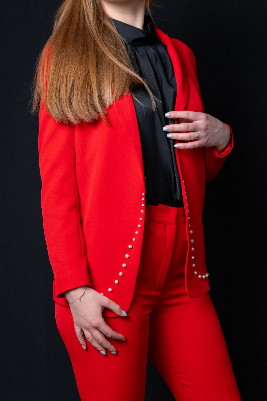 Costumul Ruby Pearl Elegance este o alegere rafinată pentru orice ocazie. Croiala sa slim adaugă un aer sofisticat, în timp ce detaliile de perlă aplicate pe sacou aduc un element de lux și stil. Cu o culoare roșie vibrantă, acest costum emană eleganță și îți oferă o purtare confortabilă, ideală pentru diverse evenimente și momente speciale.