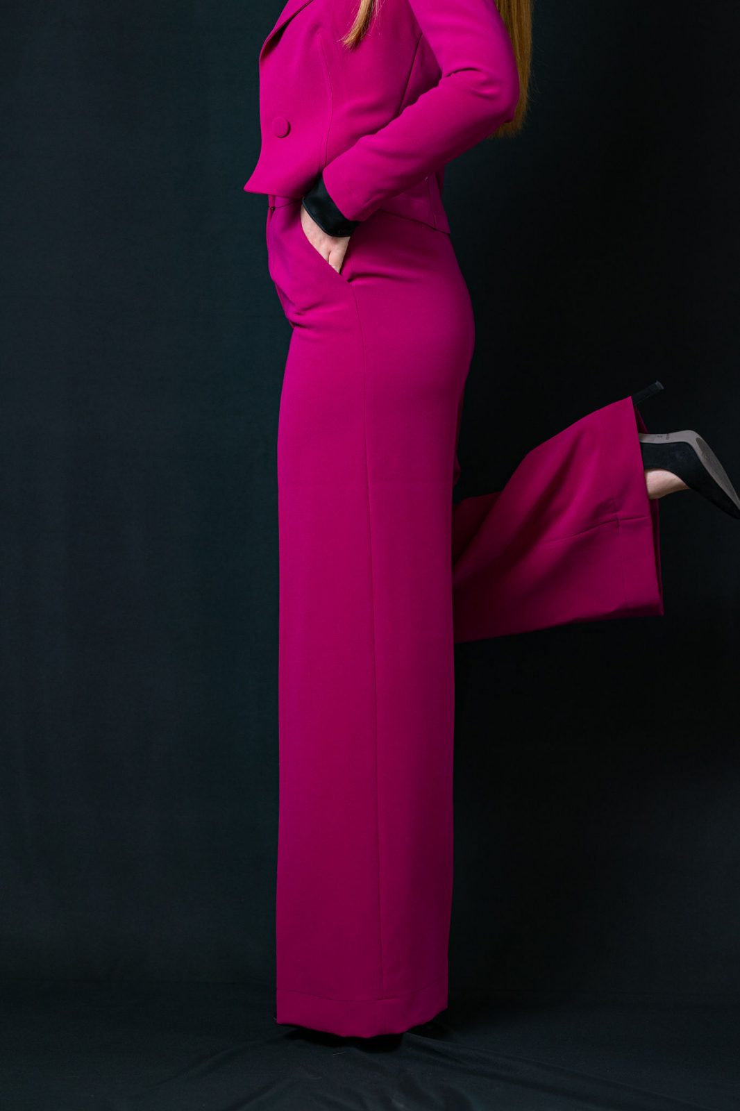 Royal Amethyst Set reinterpretează costumul feminin printr-o croială impecabilă și o culoare cu personalitate. Sacoul scurt, cambrat pe talie, pune în evidență silueta și creează un efect rafinat și structurat, în timp ce pantalonul cu talie înaltă, conturat pe șolduri și lejer pe picior, alungește linia corpului și adaugă o notă de lejeritate sofisticată.